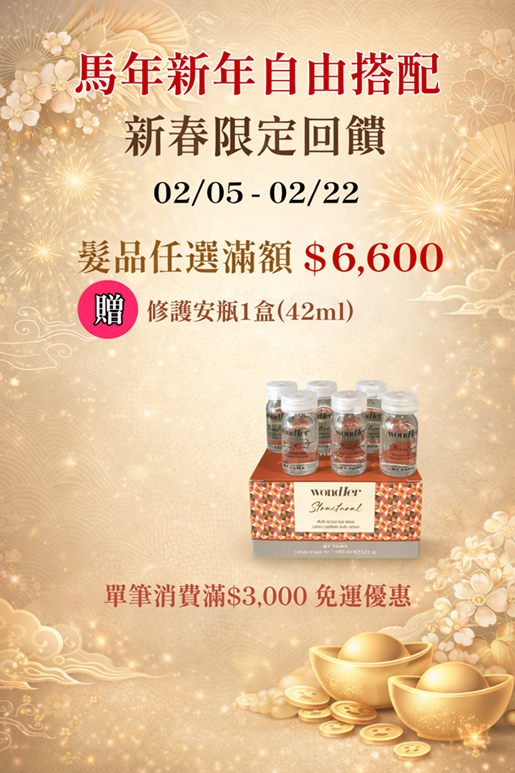 髮品任選單筆滿額 $6,600,即贈修護安瓶 1 盒(42ml)